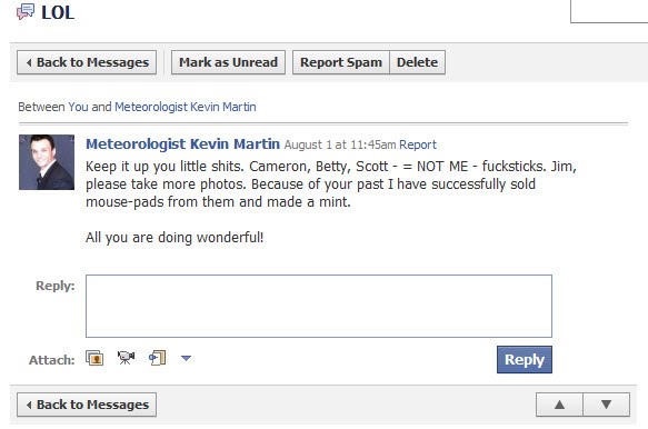 If you are associated with Kevin Martin via any website or Facebook page you are highly encouraged to remove yourself and any personal information from any of his websites and block him via Facebook or any other social media for your personal and financial security. If you were silly enough to provide him with credit card info it is suggested you report the card as lost or stolen and get a new one. Even the National Weather Service had to put out letter to the public regarding the threat Mr. Martin is to public safety and forbid their employees from any contact with him. More information on that